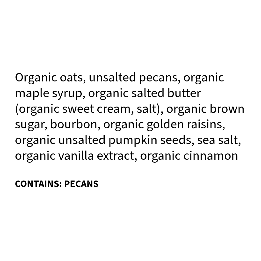 Decadence meets wholesome with toasted organic oats, pecans, and organic pumpkin seeds baked in organic butter, organic maple, and a generous splash of premium Kentucky bourbon. Warm cinnamon and vanilla make this a rich, comforting flavor you’ll crave again and again.